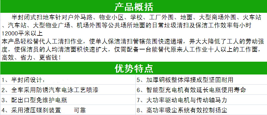 产品分类:驾驶式扫地机产品特点:1、驾驶式扫地机1580特别配备出口型免维护电瓶,区别于市面上其他电动扫地机,其智能型充电机能有效延长电瓶使用寿命,可使连续工作时间更长。2、底部主刷和两侧边刷可自由调节高度使清扫效率更高,完成1000㎡的地面清扫工作仅需6分钟。3、操作简单、使用方便,工作人员无需特别培训,“保安大叔也能轻松操纵自如”。4、配备高功率吸尘系统有效控制扬尘,特有的洒水降尘功能还可以在进行清扫地面工作的同时洒水以达到降尘作用。适用环境:物业、工厂车间、车站机场、停车场、广场、市政单位、医院、学校、大型商场等。